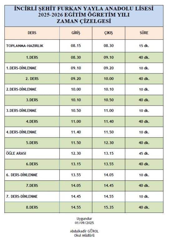 2025-2026 Eğitim Öğretim Yılı Zaman Çizelgesi